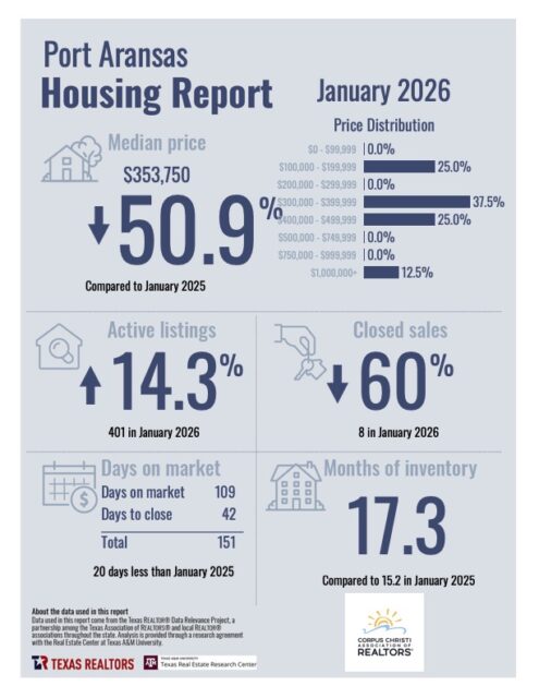Category: Real EstateBy Char AtnipFebruary 19, 2026Leave a commentPost navigationPreviousPrevious post:Housing Report- Kingsville January 2026You Might Also Be Interested In…Housing Report- Kingsville January 2026February 18, 2026Housing Report- Corpus Christi January 2026February 17, 2026VA Congressman McGuire Champions His ‘Unique’ Bill To Cut Capital Gains Tax for Senior SellersFebruary 6, 2026Super Bowl Ticket vs. a House: Some Seats Are Selling for as Much as a Down Payment on These HomesFebruary 6, 2026Housing Report- Portland December 2025January 21, 2026Housing Report- Port Aransas December 2025January 20, 2026